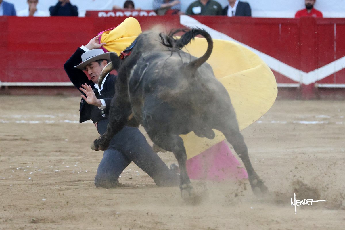 Marco Pérez abrió la tarde con el primero de su lote, un novillo de Fuente Ymbro que, desde el inicio, mostró una falta de entrega. A pesar de que el salmantino intentó conectar con el animal a través de verónicas, la falta de colaboración del novillo fue evidente, lo que derivó en una voltereta para el torero. Tras algunos problemas, logró administrar la faena con estocada cruzada que le permitió terminar con el novillo guardia, aunque el público respondió con pitos al arrastre. En su segundo, Pérez lo intentó todo, destacándose especialmente en una serie de chicuelinas ajustadas. Con la mano derecha logró sacar algunas tandas de calidad, pero el novillo, aunque acelerado, no brindó más que momentos aislados de lucidez. El salmantino estuvo más firme en su planteamiento, logrando una faena ajustada, aunque no del todo completa. Tras un pinchazo y estocada, Pérez se llevó una oreja.