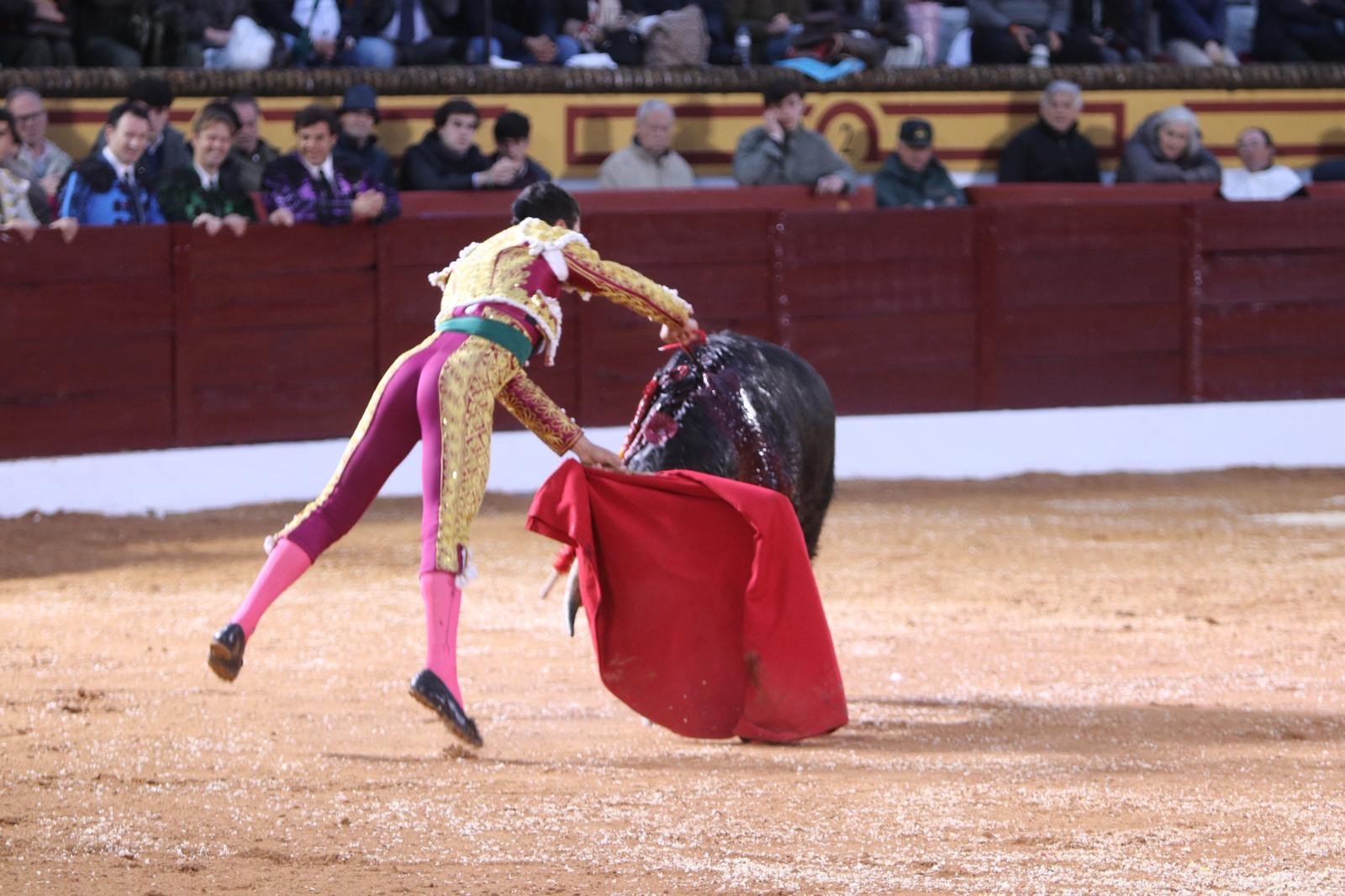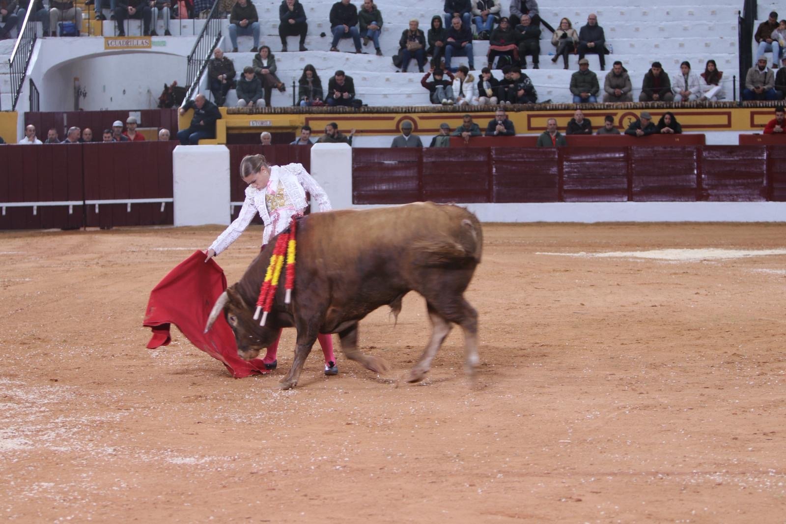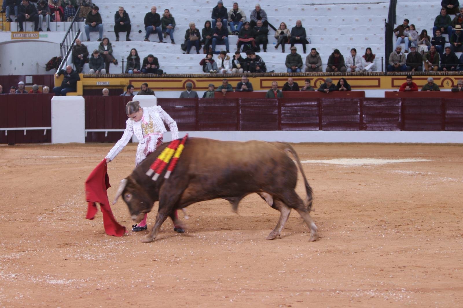 En su segundo tampoco logró centrarse con el capote a la verónica. Ya con la muleta inició la faena de rodillas sobre el albero, gesto que conectó con el público. Supo llevar al novillo por ambas manos, pisando terrenos comprometidos y siempre bien colocado. Sin embargo, la faena resultó acelerada y faltó templanza para redondearla. Tras pinchazo y estocada tendida escuchó dos avisos y, pese a la petición, saludó desde el tercio.