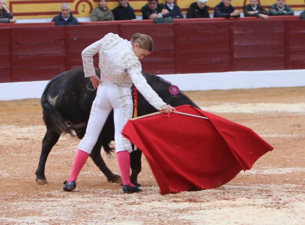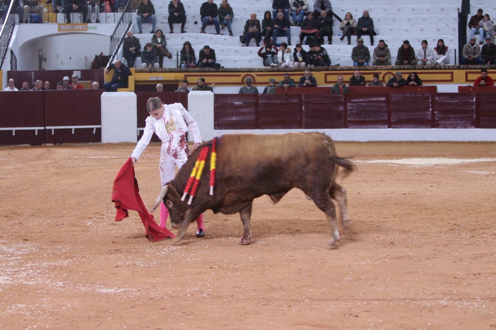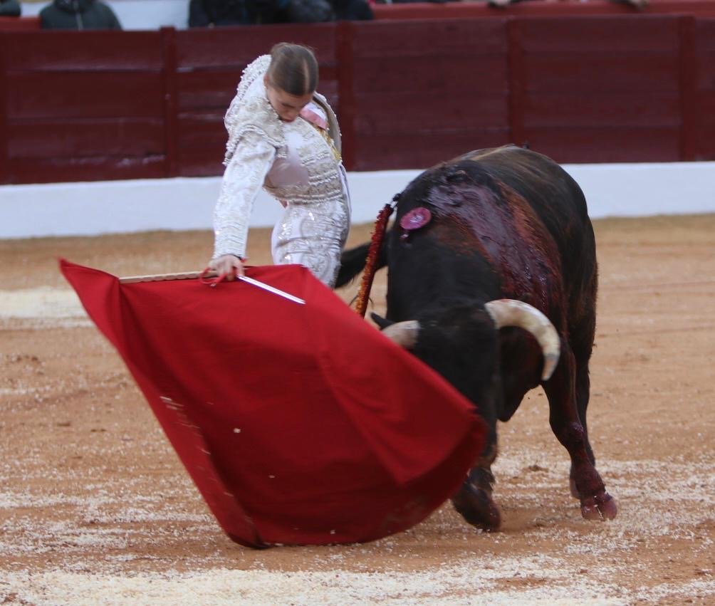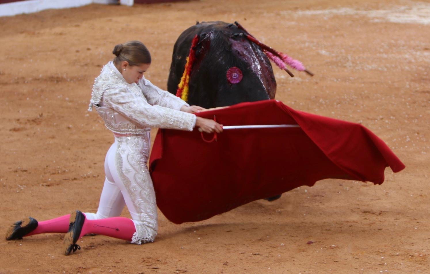 En su segundo lo recibió doblándose con el capote. Con la muleta inició la faena con estatuarios y trató de marcar distancias por ambos pitones. El novillo, con comportamiento de auténtico buey de carreta y escasa transmisión, apenas permitió continuidad. La torera insistió y, tras una estocada, cortó una oreja.